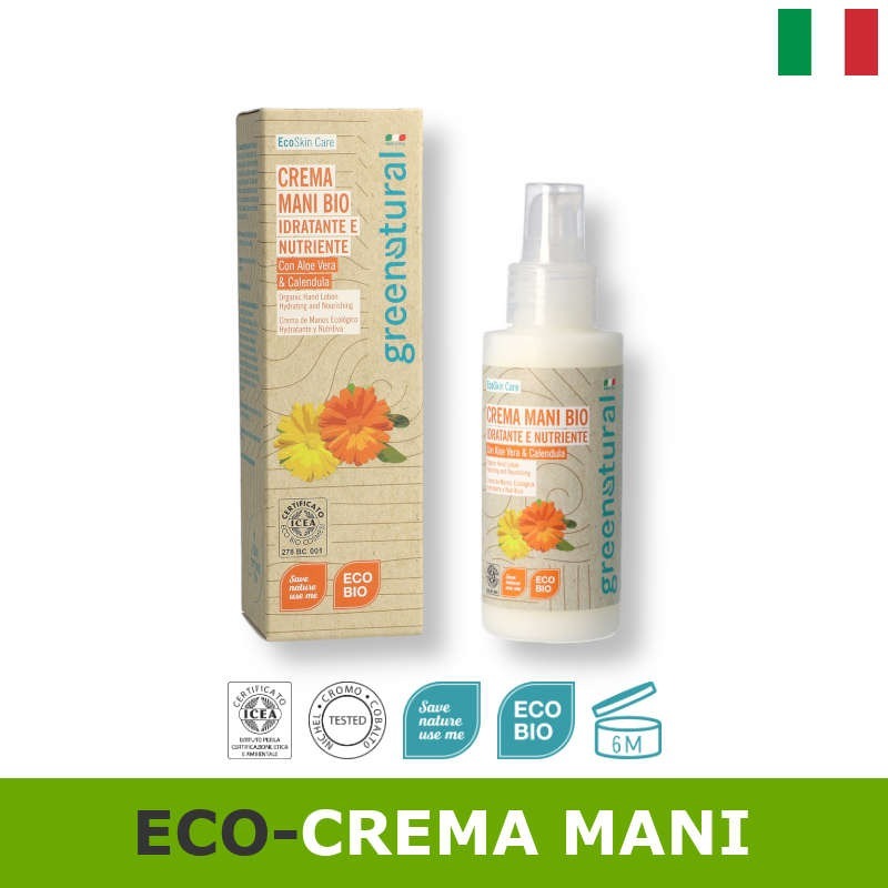 Ecoskin care crema mani Aloe Vera & Calendula da 100 ml. Certificazione Icea EcoBioCosmesi. Crema morbida, di facile assorbimento, rende la pelle morbida, idratata ed elastica, inoltre protegge dalle aggressioni esterne (freddo, vento, smog, detersivi) formando una barriera. Idea regalo che dona sollievo alla pelle eventualmente arrossata e screpolata. Ordina ora i nostri cosmetici o contattaci